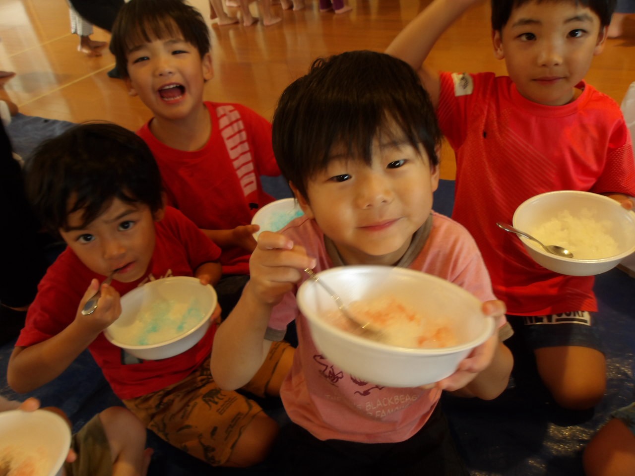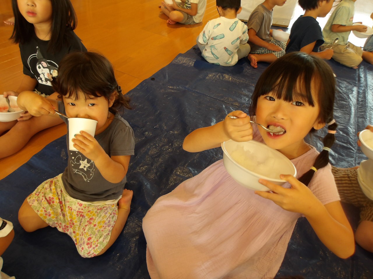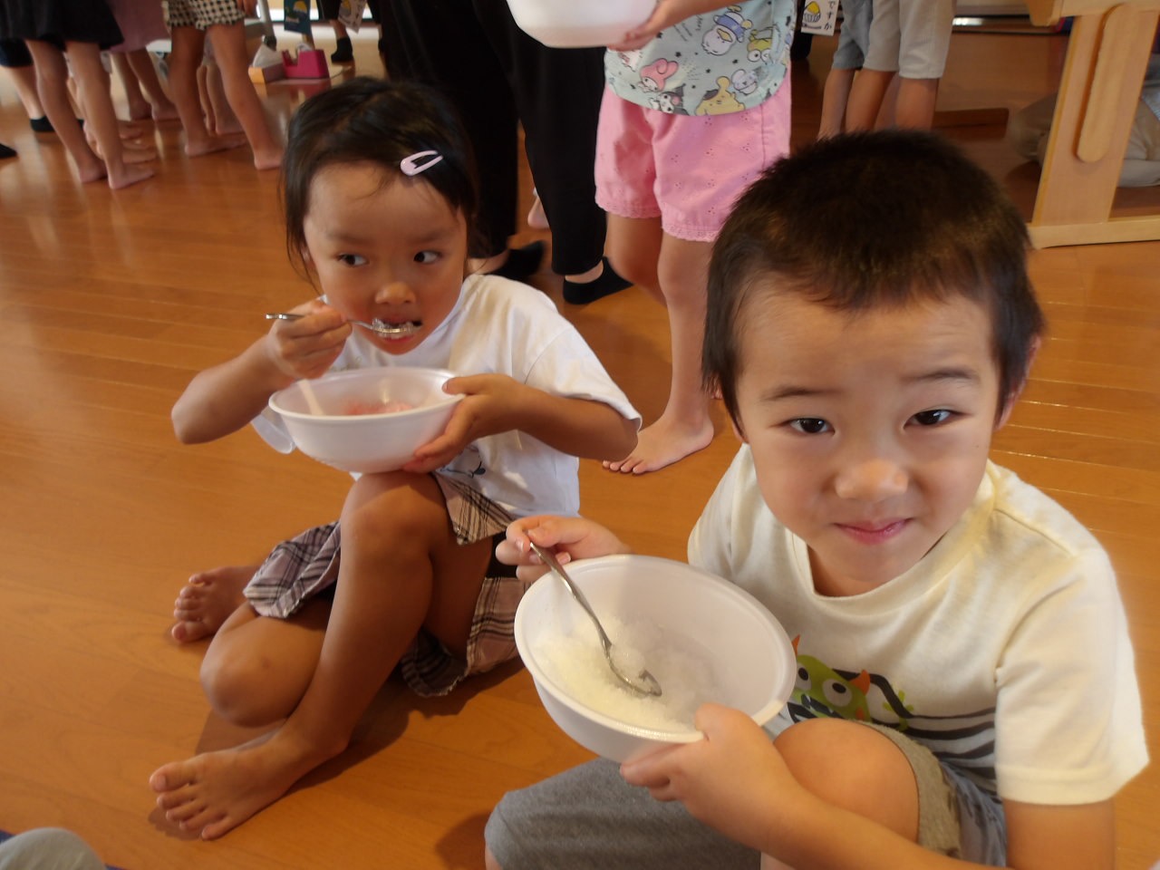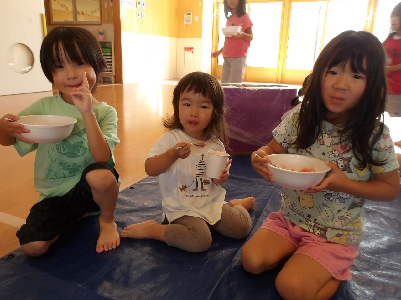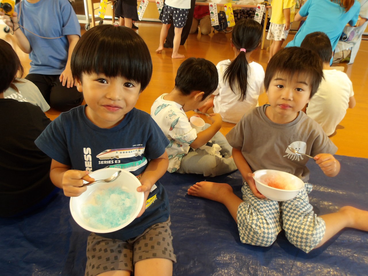 8月7日に第2弾のかき氷を食べました!今回はかしおぺあ(2歳児)のお友だちも一緒に!はやぶさ(5歳児)のお兄さん、お姉さんに手をつないでもらって嬉しそうでした。