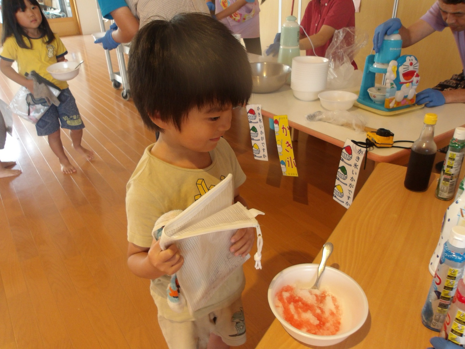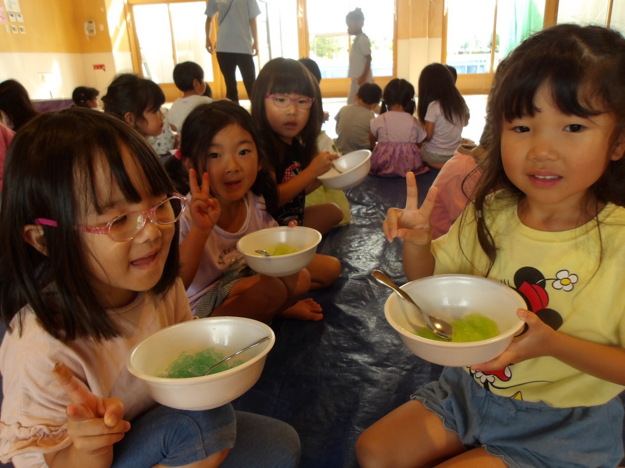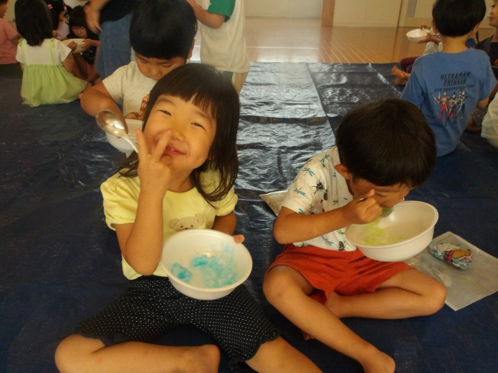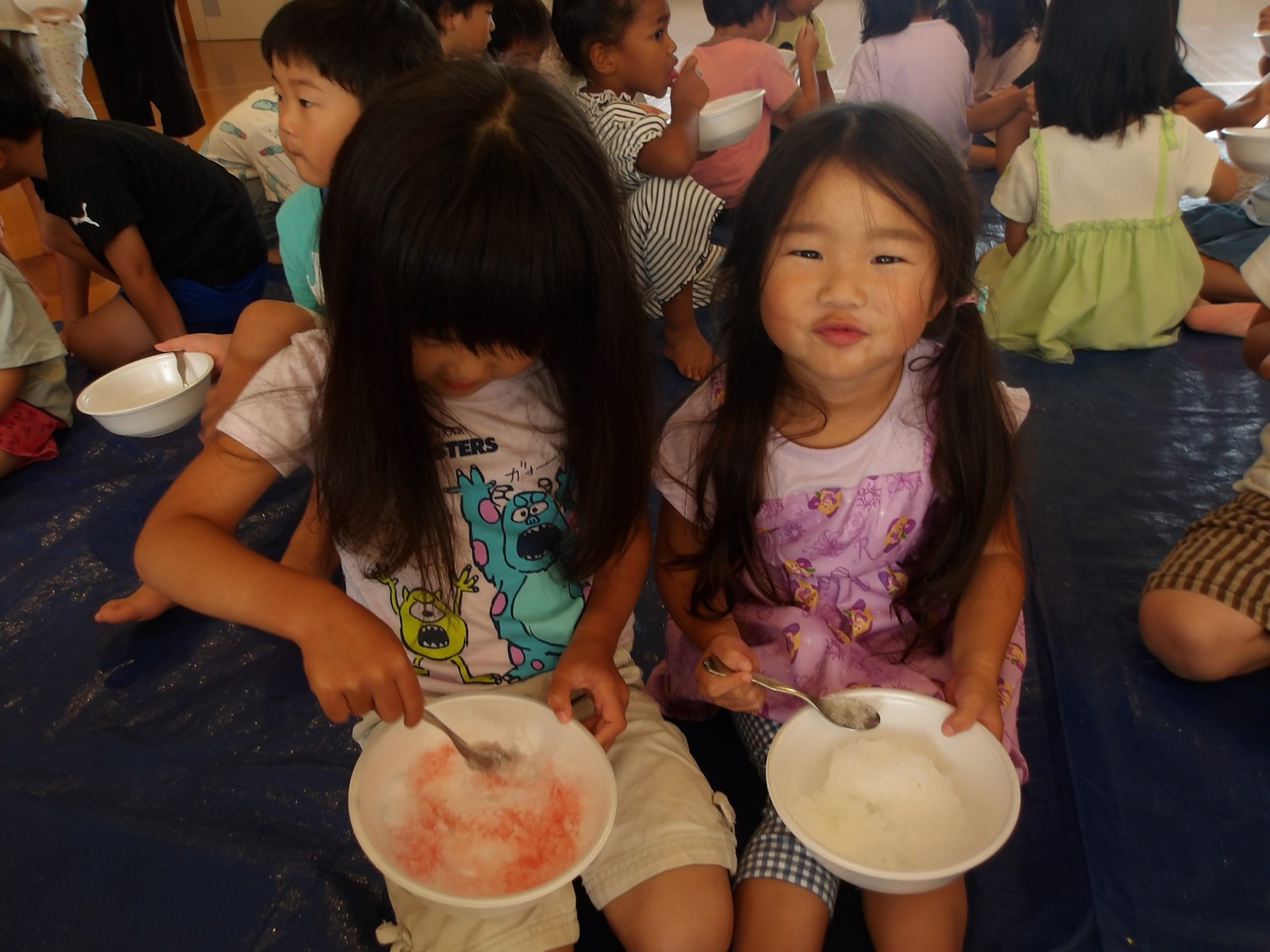 8月7日に第2弾のかき氷を食べました!今回はかしおぺあ(2歳児)のお友だちも一緒に!はやぶさ(5歳児)のお兄さん、お姉さんに手をつないでもらって嬉しそうでした。