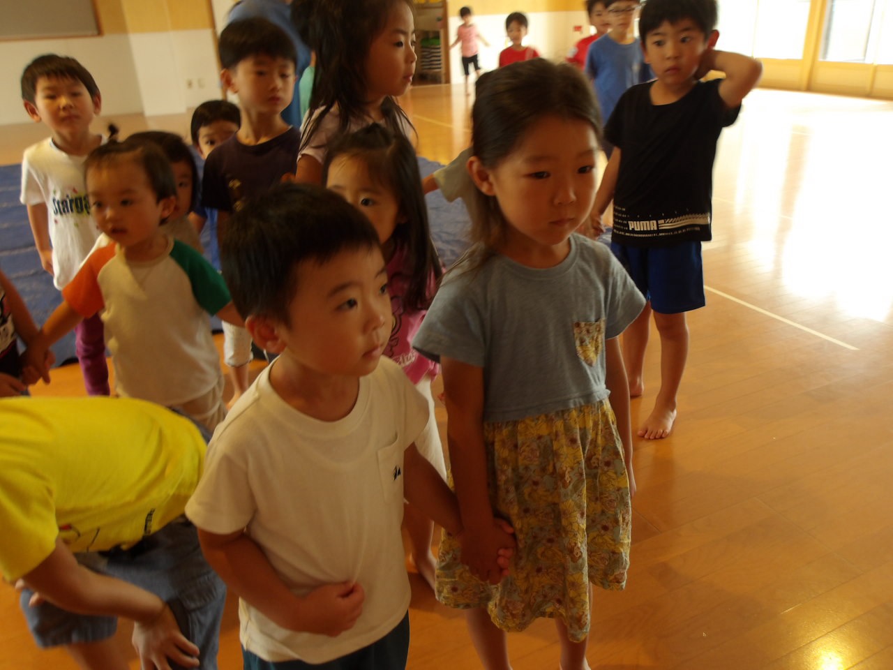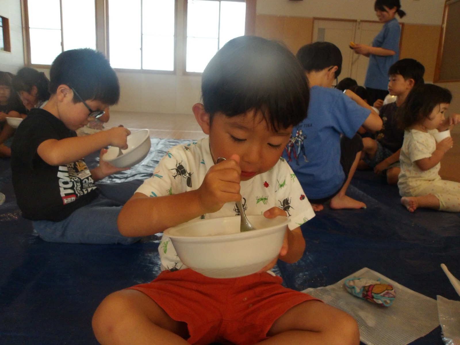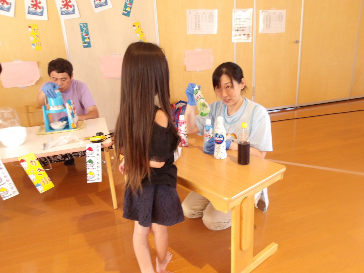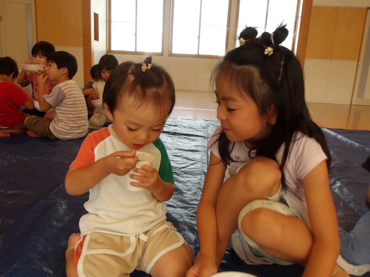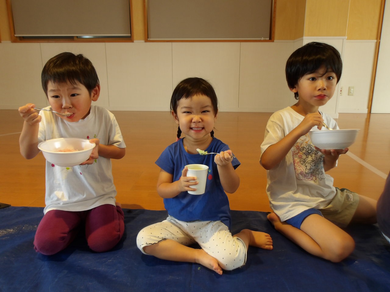 8月7日に第2弾のかき氷を食べました!今回はかしおぺあ(2歳児)のお友だちも一緒に!はやぶさ(5歳児)のお兄さん、お姉さんに手をつないでもらって嬉しそうでした。