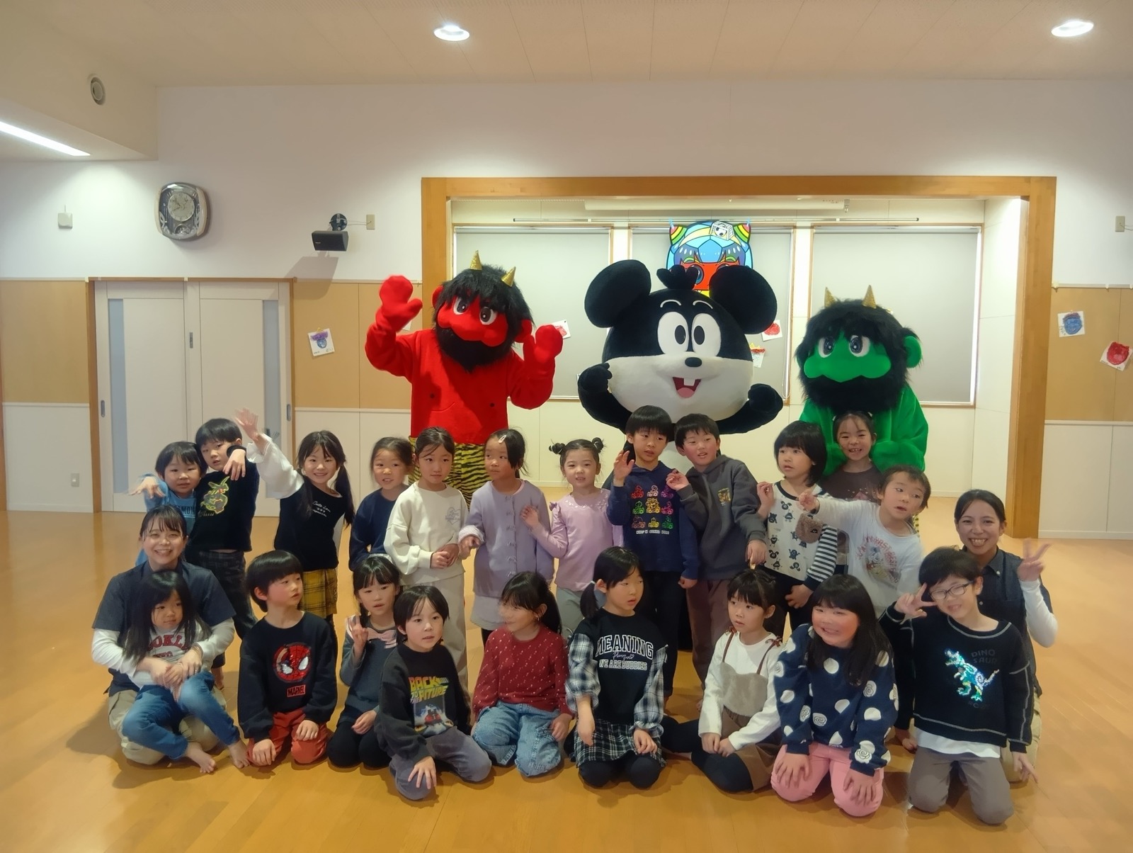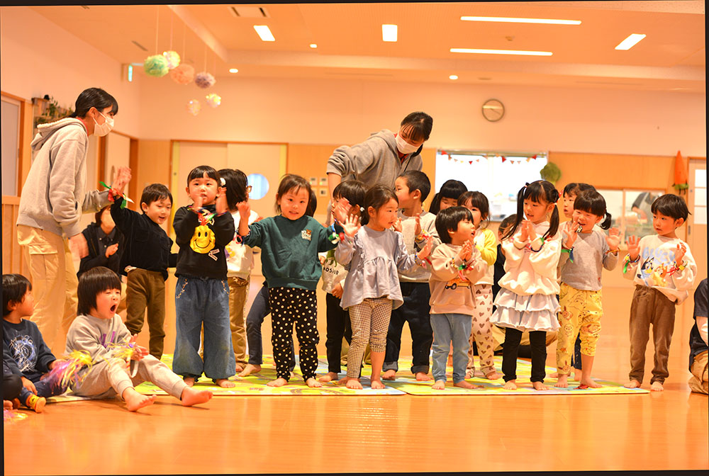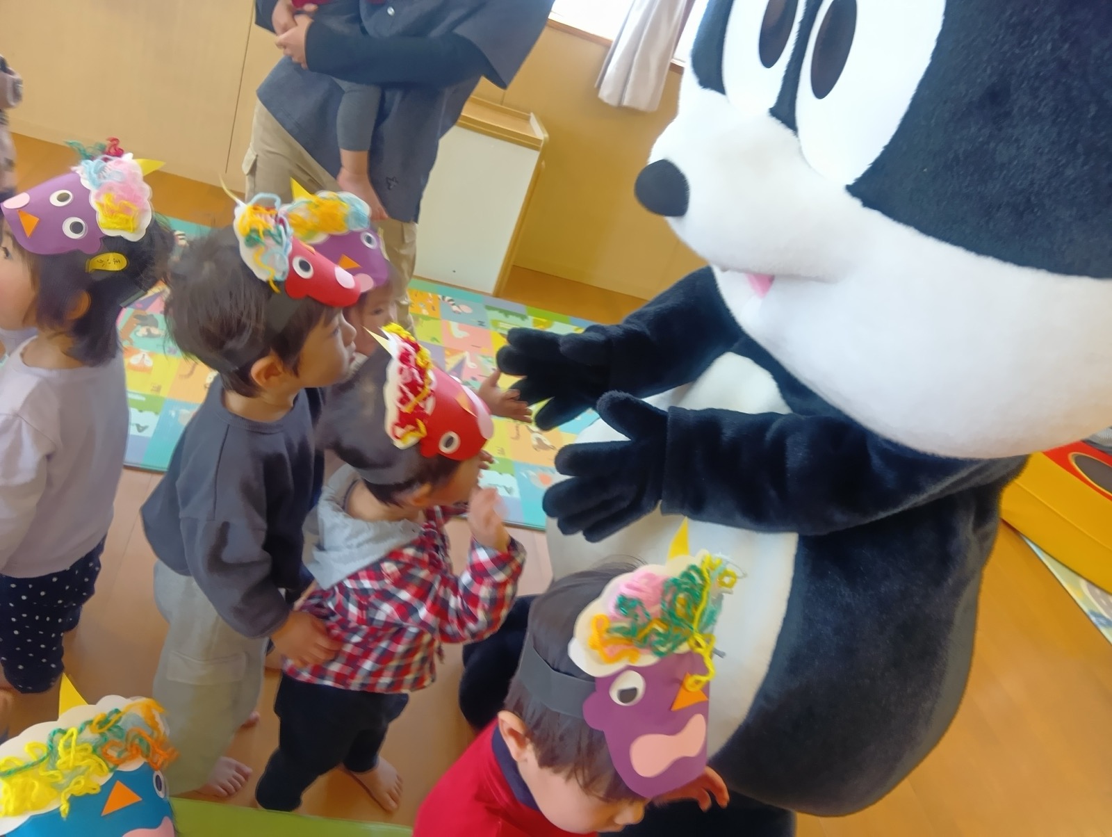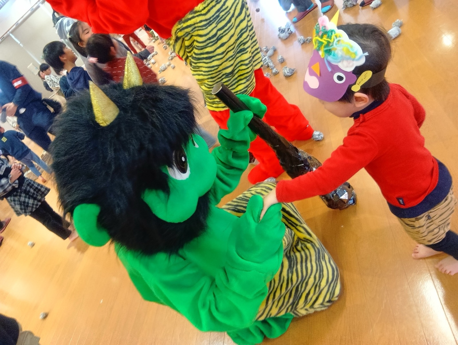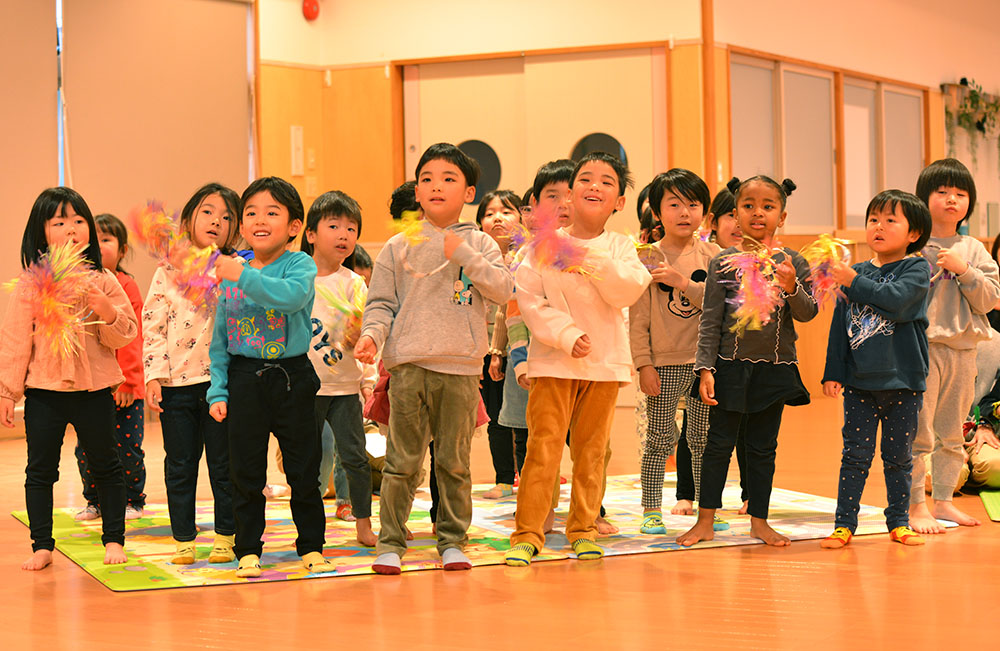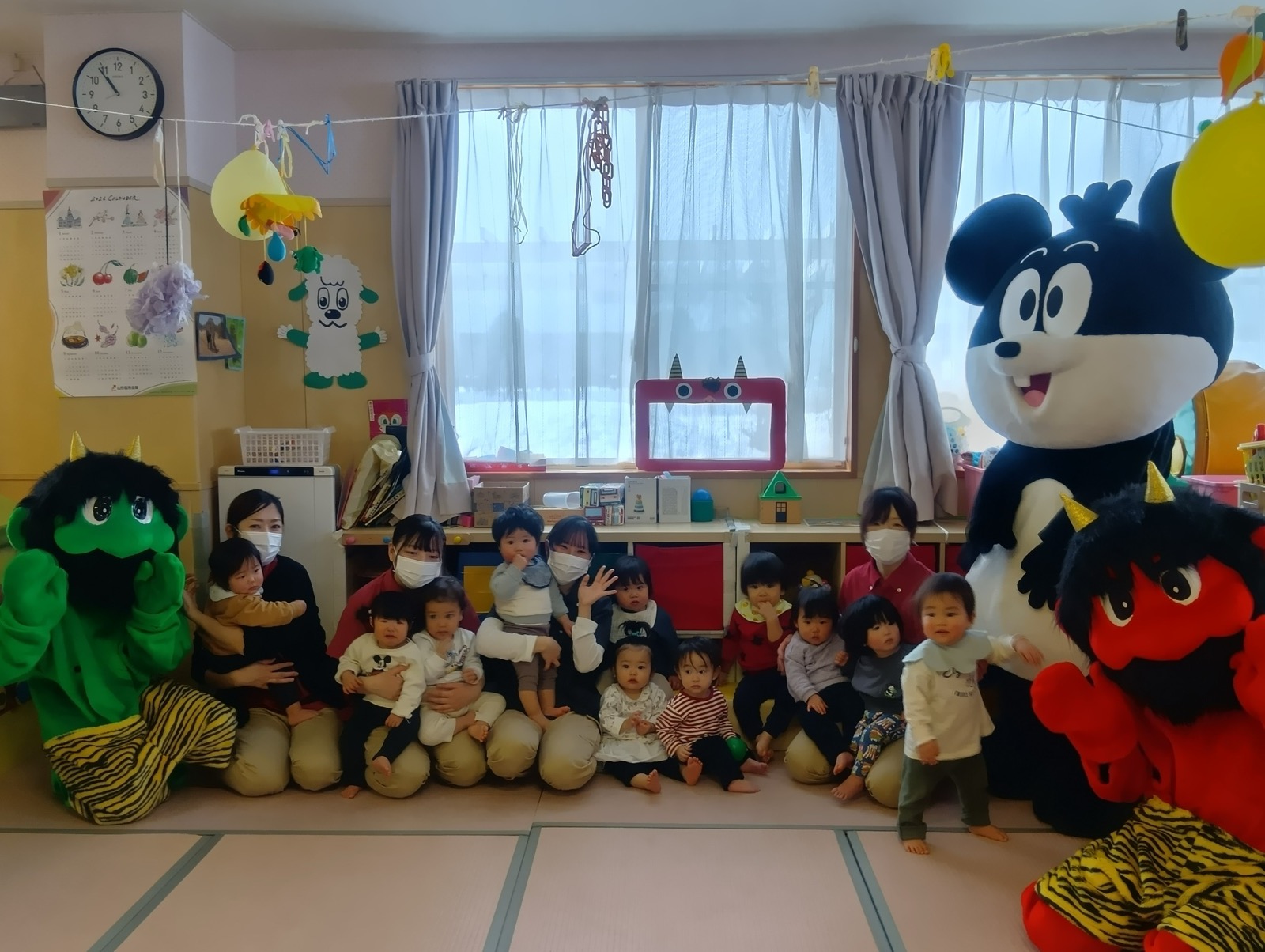 2月3日に豆まきが行われました。でんろくのでんちゃんと鬼が登場。みんなで作戦会議をして、子ども達お手製の武器で身を守ったり、攻撃をしたりして鬼を退治しました。おかげで、みんなの心の鬼も一緒に退治することができたようです。弱った鬼に優しくする姿も見られ、最後は仲良く一緒に記念写真を撮りました。