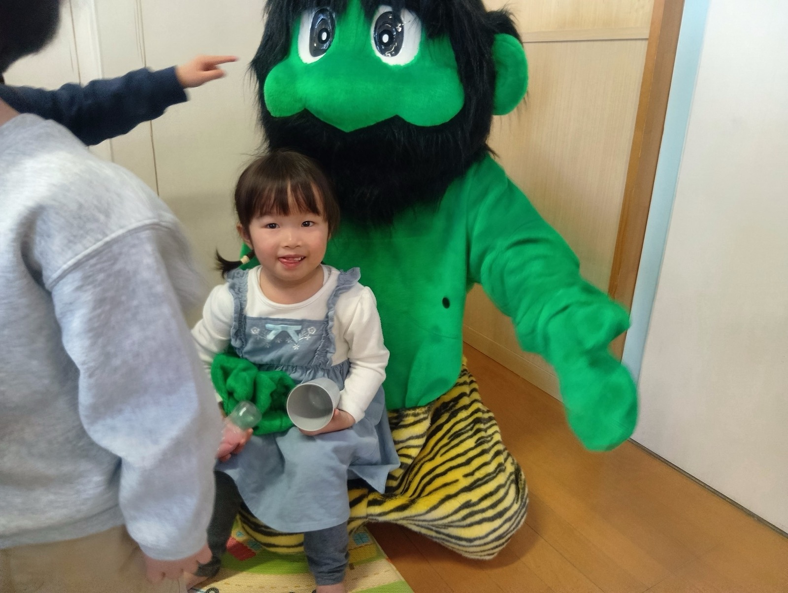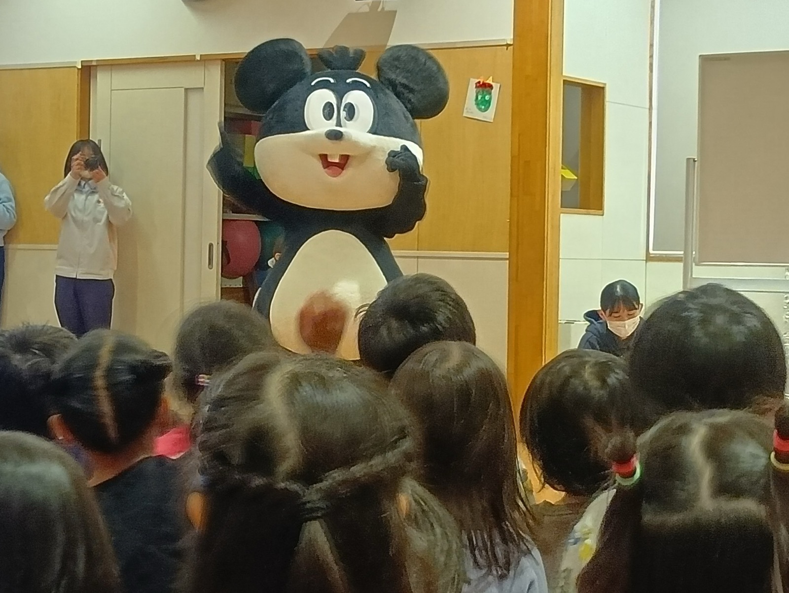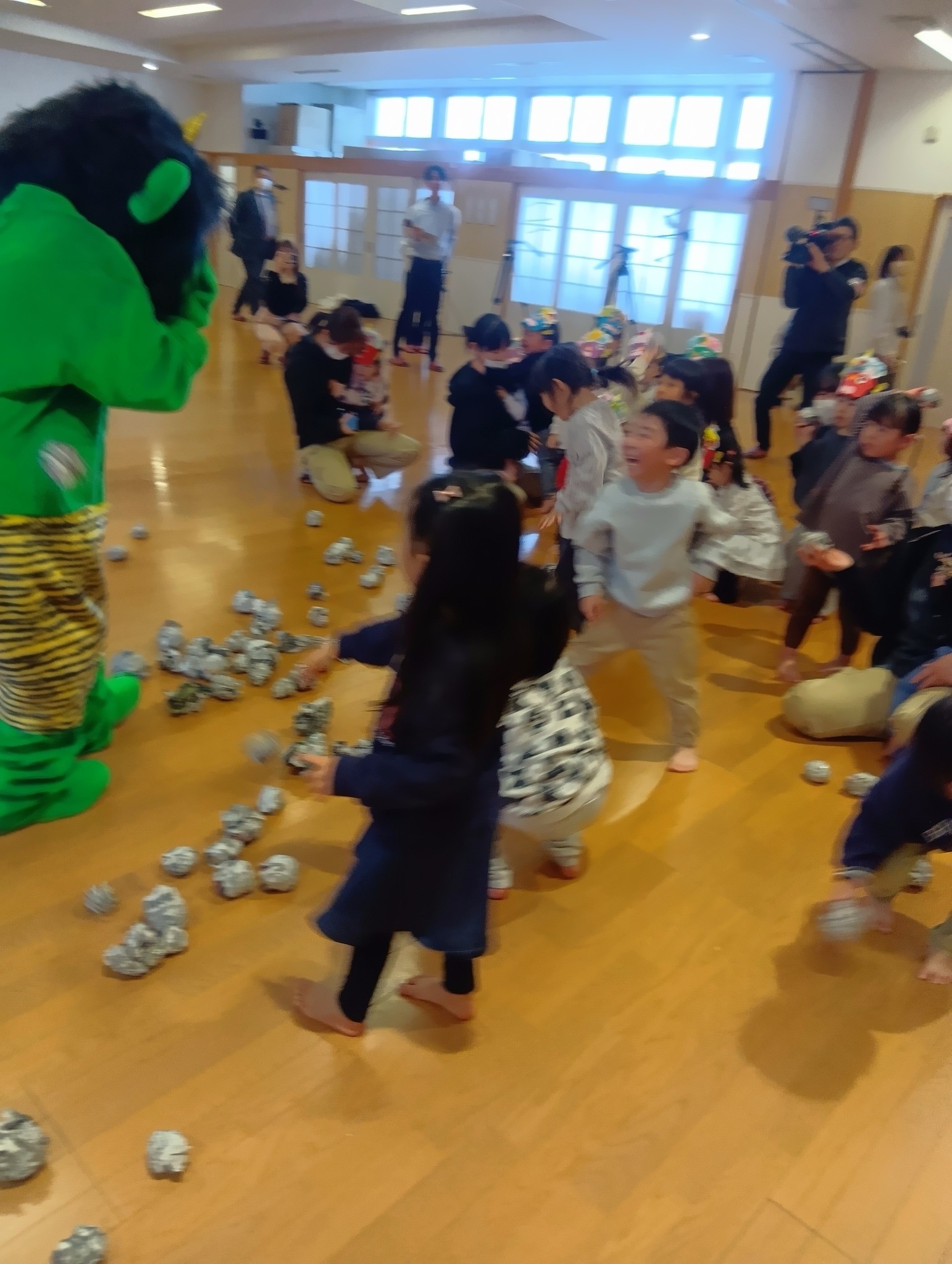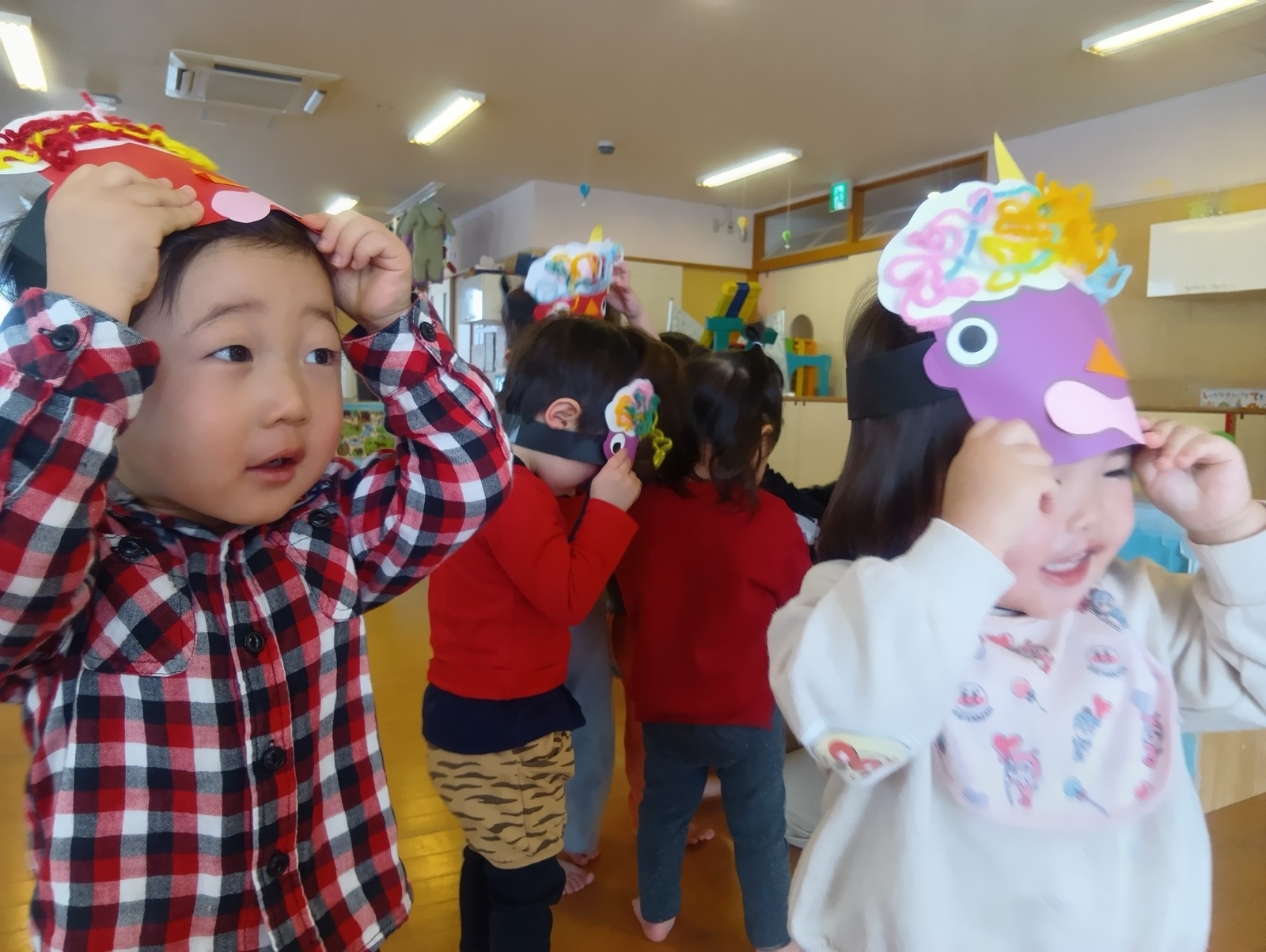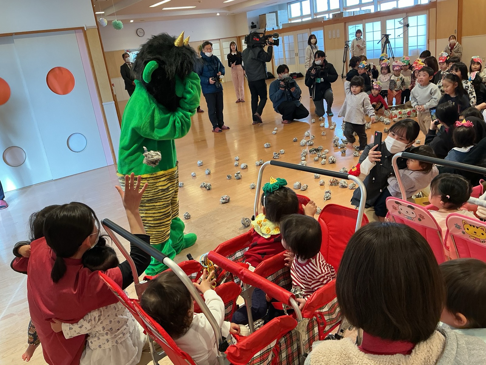 2月3日に豆まきが行われました。でんろくのでんちゃんと鬼が登場。みんなで作戦会議をして、子ども達お手製の武器で身を守ったり、攻撃をしたりして鬼を退治しました。おかげで、みんなの心の鬼も一緒に退治することができたようです。弱った鬼に優しくする姿も見られ、最後は仲良く一緒に記念写真を撮りました。