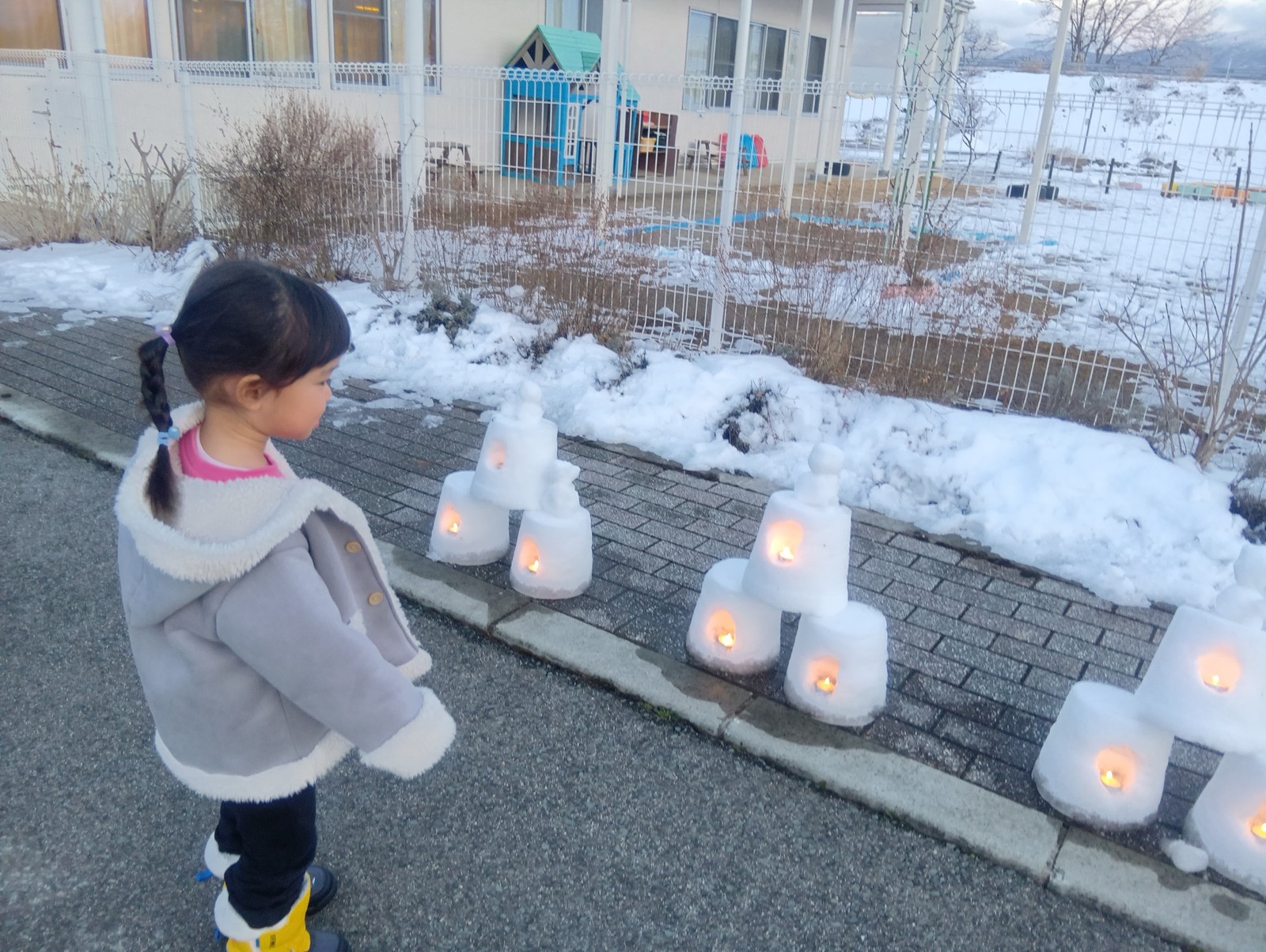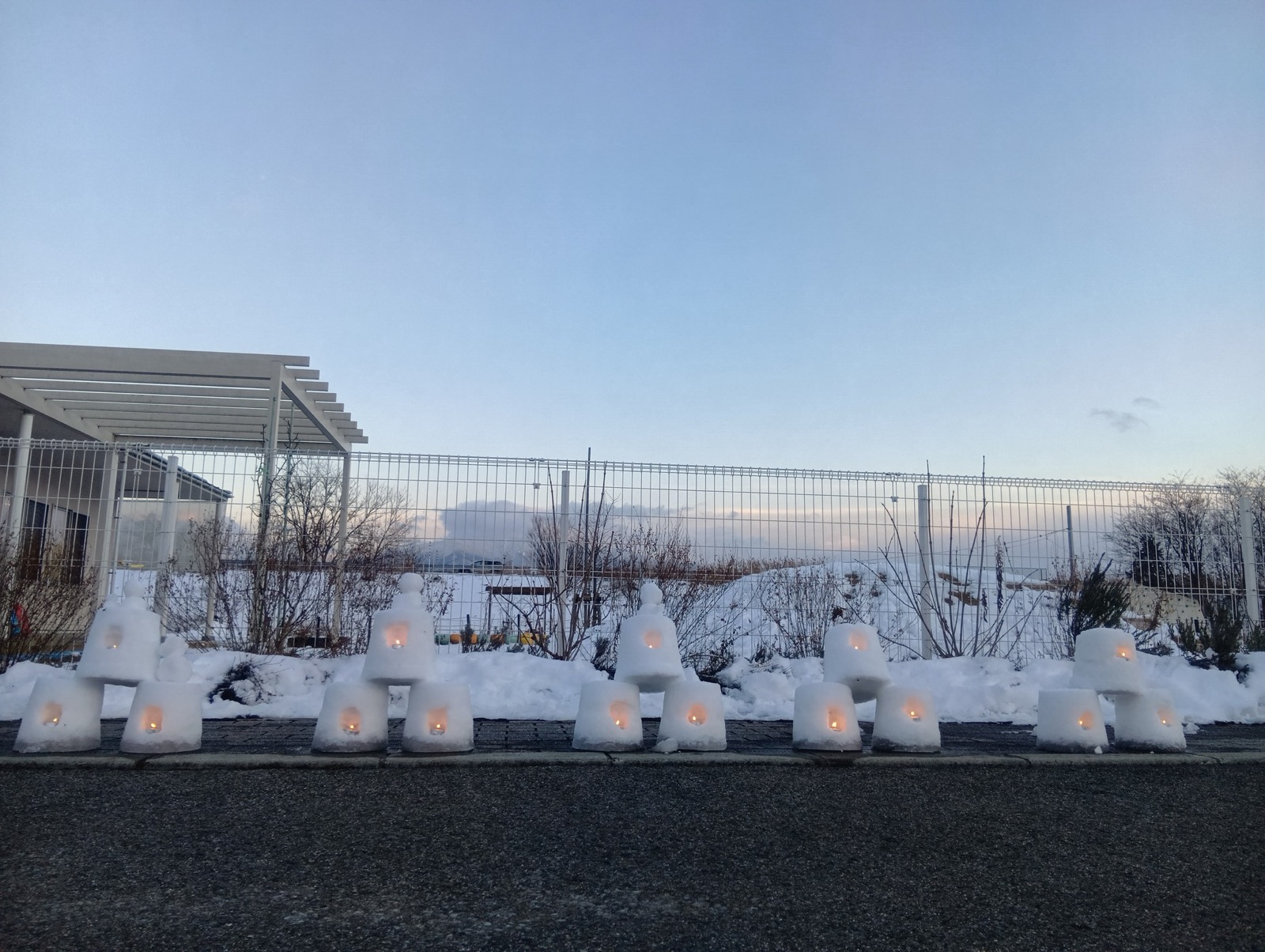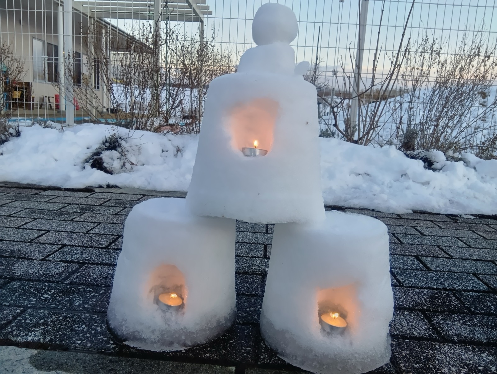 はやぶさ保育園に雪灯籠がお目見え!先生と子ども達で協力して作り上げました。夕方には灯りがともり、雪を通した光がふんわりと広がっていました。